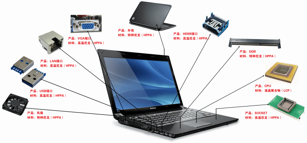 高溫尼龍可取代金屬達(dá)到輕薄設(shè)計,可應(yīng)用在筆電外殼、平板外殼,優(yōu)異的耐高溫性和尺寸穩(wěn)定性使其在筆電的風(fēng)扇、接口廣泛應(yīng)用。